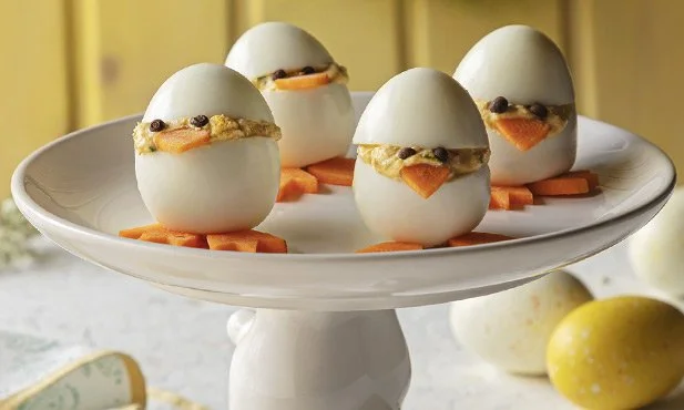 Recheie as claras com a mistura de gemas, tape com a tampa e faça dois olhos com os grãos de pimenta, um bico com o triângulo de cenoura e, por fim, disponha num prato e coloque as patinhas.