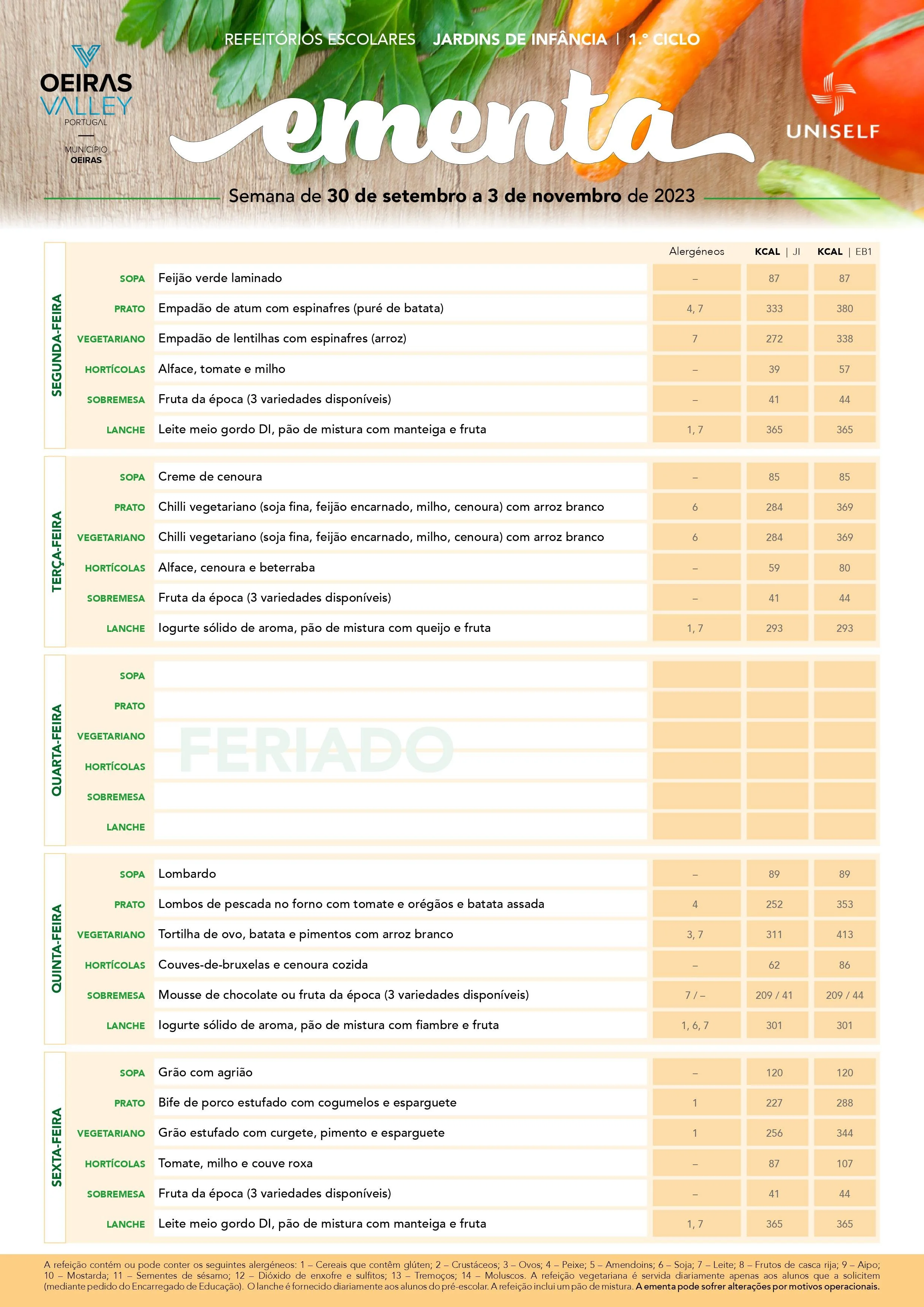 Ementa da semana 30/10 Escrito por Rita Lopes | APGFA 5ª semana- de 30 de outubro a 3 de novembro Rita Lopes | APGFA